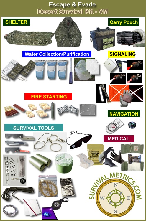 NOTE: This military survival kit is restricted to purchases by and for U.S. military personnel, U.S. government agencies, and U.S. military contractors. All others may purchase the Escape & Evade Desert Survival Kit VCM model.For the Desert VCM Model (for both civilian and military) Click Here
