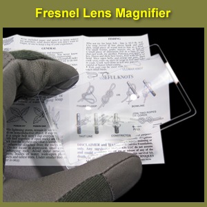 A flat magnifying lens, 2 in. x 3 in. Used to start fires using the sun, and to read small print, especially if glasses are lost.